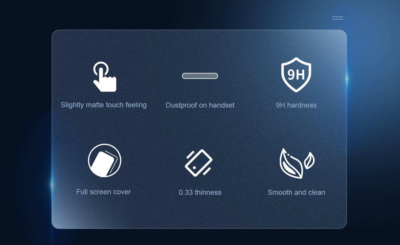 Using AGC glass material imported from Japan with great defensive. Matte crafting on the surface prevent the fingerprint and grease, and give you the best gaming experience. Cover with anti-glare coating can effectively prevent the dazzle light occurred. Special tempered glass with 9H hardness applied, it is also anti-explosion and anti-scratch. A 0.33mm thinness makes an original hand feeling. Using CNC cutting technique, 2.5D edge grinding process, and give you a original touching feeling on the screen.