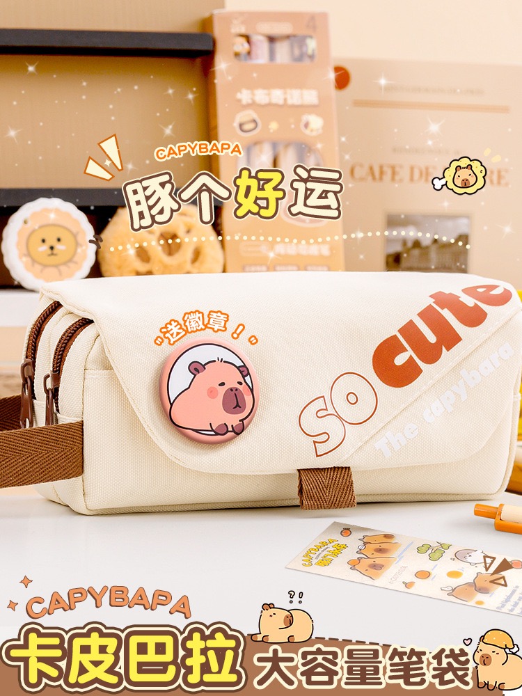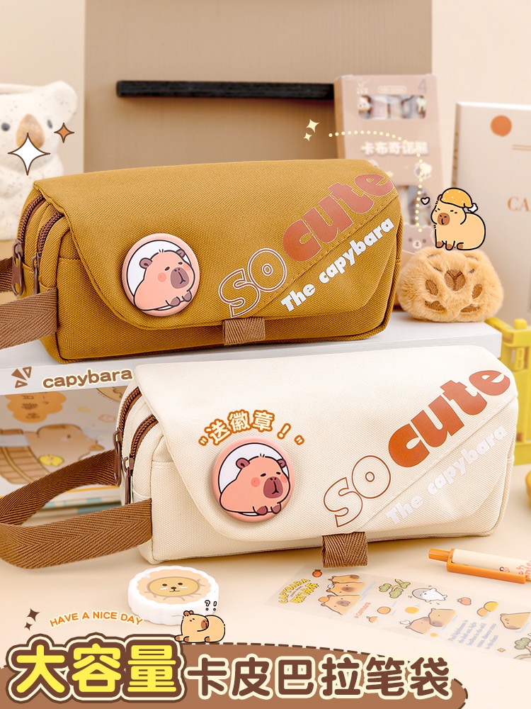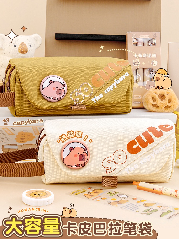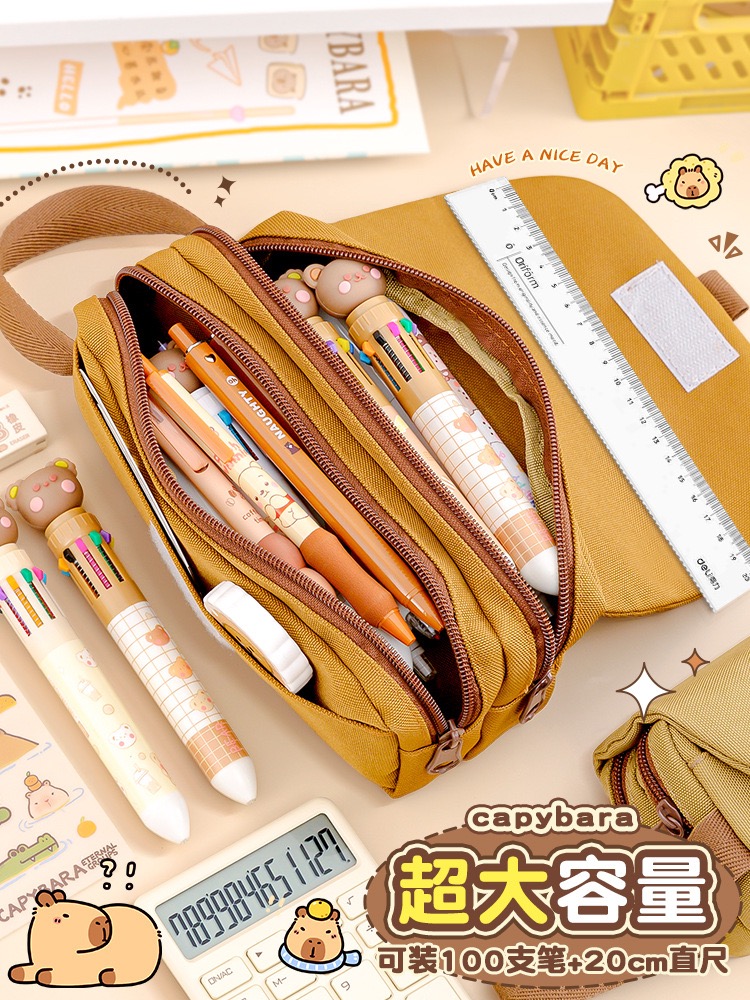 Large-capacity 3-layer pencil case made of durable fabric. Keep your pens, pencils, and stationery neatly organized. Available in Brown, Khaki, and Cream.